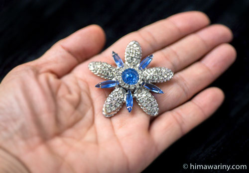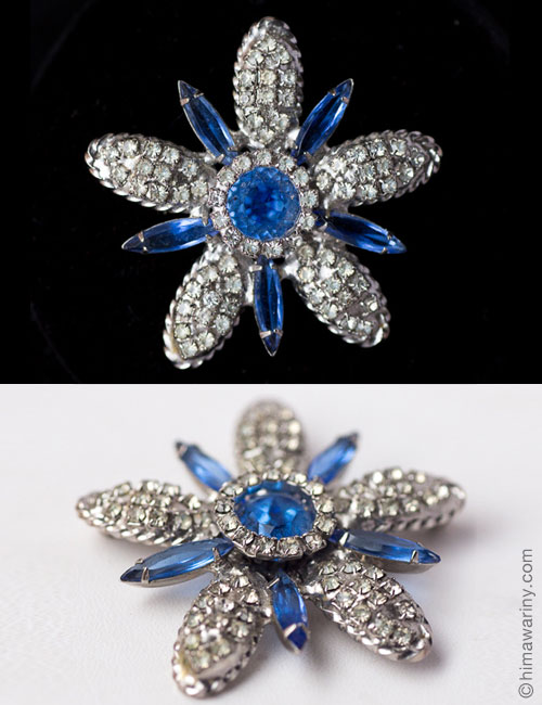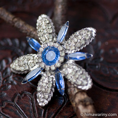 燻し銀のようなアンティークシルバーカラーに、しっとりと根付いて輝きかけてくるパヴェのラインストーン。そこに澄んだ海のような透明感のスレンダーなマーキースシェイプのファセットカットストーンが清らかに輝いている。花のエレガンスと、海をみつめる星の透徹した美しさ、そういったものが合わさったかのようなアンティーク・ブローチ。