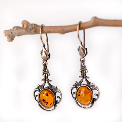 琥珀のカボションがフィリグリーシルバーの中央にセットされたヴィンテージ・ピアス。フック部分に開閉するトライアングルの留め金のついた丁寧な造りのお品です。アンバーカラーが、光の透過具合で色味が変わって綺麗です。