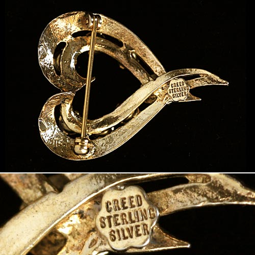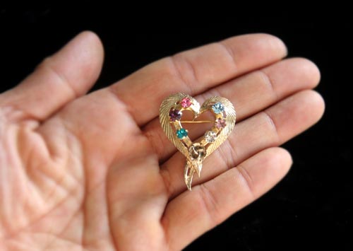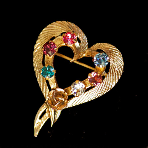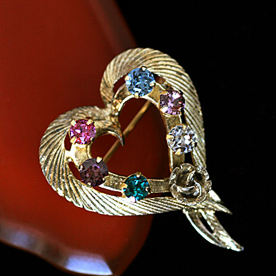 ルビーピンク、トパーズブルー、濃淡アメジストパープル、エメラルドグリーン、クリスタルクリアー、6つの爪留めラインストーンがハート型リボンに散りばめられたヴィンテージのスターリング