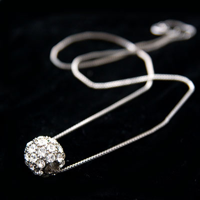 クリスタルボールは、ミラーボールのよう。燻し銀がかったベースが、きらきらラインストーンをシックに引き立てています。チェーンは、小さな立方体のパーツが交互に連ねられたベネチアンチェーンと呼ばれるスタイル。細くストレートなラインが表現され、また、ミラーボールが大きさの割りにずっしりと重いので、胸元に描かれるチェーンのV字がすっきり綺麗です。