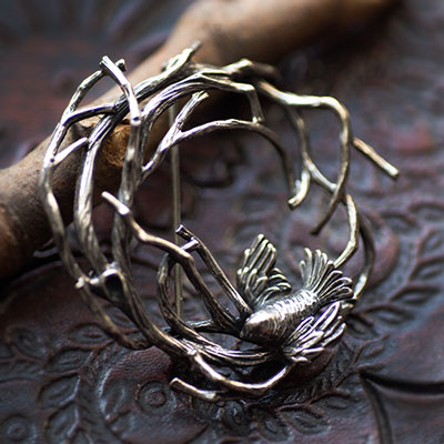 深い森、枝を広げる荘厳な樹木、柔らかな羽毛をうねらせ風をきって飛ぶ小鳥。お伽噺のような世界観が広がる渋かわいいアンティーク・ブローチです。