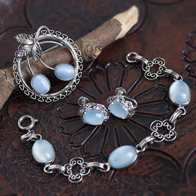 ●カラー、材質:シルバーカラーメタル(イヤリングとブレスレットには、材質が銀 スターリングシルバーである刻印入り)、ムーンストーンまたはムーンストーンのようなカボション