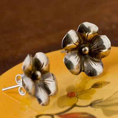 ハンドメイドっぽい造りがかわいいシルバーのヴィンテージ・フラワー・ピアス。燻し銀のアンティークっぽいお色がこの花のイメージにぴったりでとても素敵です。