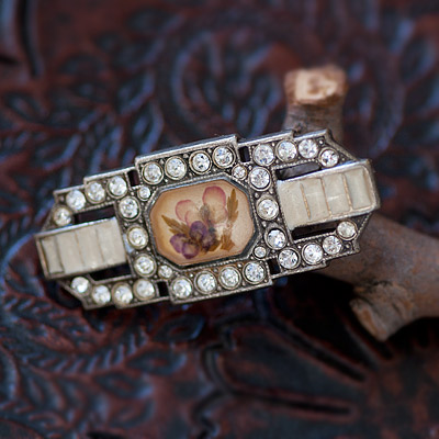 ピンクと紫の小さな小さな野の花が、押し花として時とともに封じ込められたアンティーク・ブローチ。アールデコ・スタイルのフレームには、大小のラインストーンがペーストされていて、今も美しく輝いています。