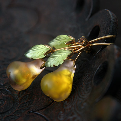 ●状態:★★★☆ビンテージ・ベリーグッド(ガラスの裏の箔に経年によるむらのようなものが見られますが、ガラスにほどこした茶色の意図的な柄もあるので、わかりにくいです。ぱっとみた全体の感じは、とてもキレイです。ガラス本体自体は、この種のブローチとしてはミントと呼べる素晴らしいコンディションです。)