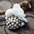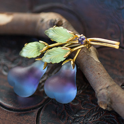梨はボスクペアでしょうか。フロストガラス・タイプで、やや紫味を帯びたブルーにグレープジュース色のさし色。フルーツガラス・カボションとマッチしたパープルのラインストーンが一粒。光の方向で表情が変わり、葉っぱも、底の方から光るような、フルーツガラス独特の綺麗な輝きをみせています。爽やかな雰囲気にも、こっくりほっこり秋冬のお色との相性もいい素敵なブローチです。