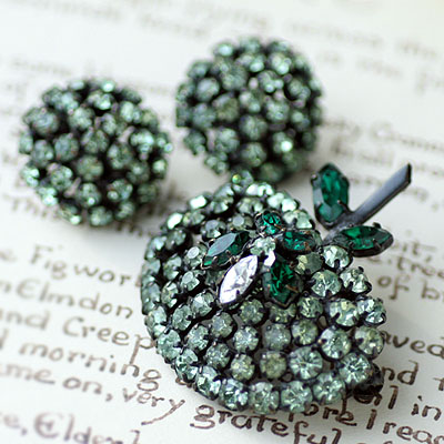 ブローチのフルーツ部分、イヤリングは、中央がやや膨らんだドーム型。エメラルドグリーン、アップルグリーン、クリアと、ラインストーンは、すべてプロングセット(爪留め)で、オープンワークになっています。