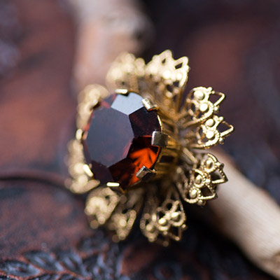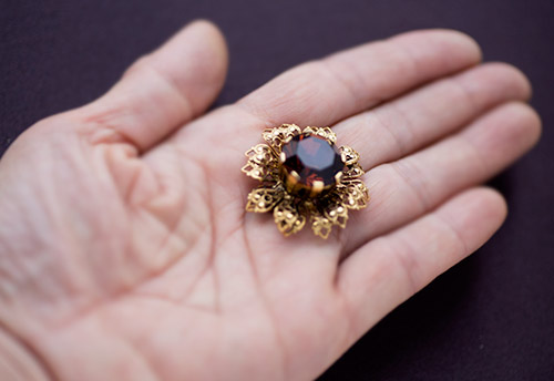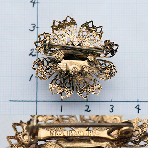 スワロフスキーしかり、古くからガラスやラインストーンの高いクオリティに定評のあるオーストリア製のお品で、こちらのブローチのストーンも、その深さと透明感のあるお色の感じがなんともいえず素敵です。