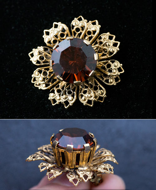 直径薬16mmのアンバーカラーのラインストーンが、ブリリアントカットの立て爪ダイヤモンドのように中央にセットされたアンティーク・ブローチ。レースのようなフィリグリーの花びらがぐるりとりまいています。