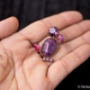 頭はアメジストパープルのラウンドシェイプ、くちばしはそれよりはややマジェンタがかったパープルのティアドロップ、尾羽根は更に微妙にピンク系パープルのスレンダーなマーキースシェイプ、そして足は3粒の小さなラウンドシェイプのラインストーン。