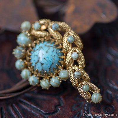 有機的な模様、色合いの大小様々なアートガラスが魅力的なアンティーク・ブローチ。センターピースは、ミルキーなターコイズ・アートガラスが、王冠のような台座にセットされています。