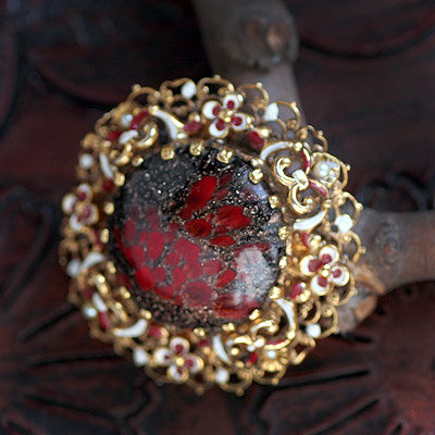 黒地に赤味がかったゴールドの無数の星、その中から赤い星雲が浮かび上がったような印象的な大粒のガラスカボションが中央に爪留めされたヴィンテージ・ブローチ。