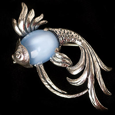 ゆらゆらと水中をただよう金魚、ベタの背びれ、尾びれの感じがとても美しく表現されたアンティーク・シルバー・ブローチ。ジェリーベリー (=英語でジェリーのようなおなかの意) のカボションが、ムーンストーンのように見る方向で陰影、輝きを変える様、その色合いが、きらきらと光り、揺れる水のイメージと重なります。