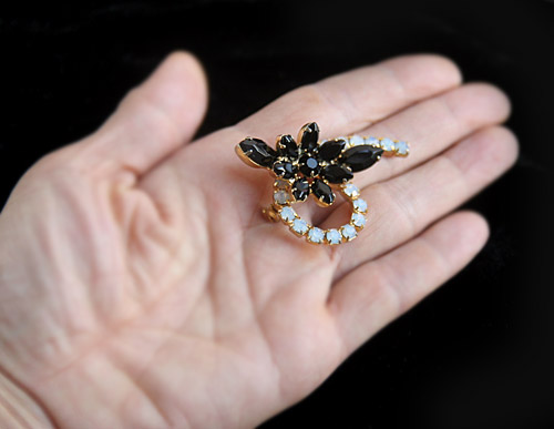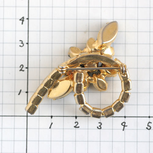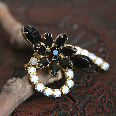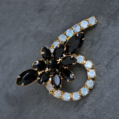 プロングセット(爪留め)マーキースシェープ・ラインストーンのフラワーモチーフが、ラウンドシェープのラインストーンの連なりの上にあしらわれたヴィンテージ・ブローチ。