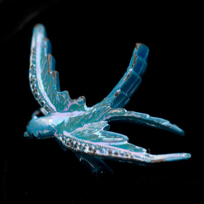 とても小さなかわいらしいツバメのヴィンテージ・ブローチ。メタルの土台に少しグレーがかった水色のエナメル塗り、その上に、光の角度によってグリーン~ブルー~パープルに色を変えるオーロラ加工が施されています。