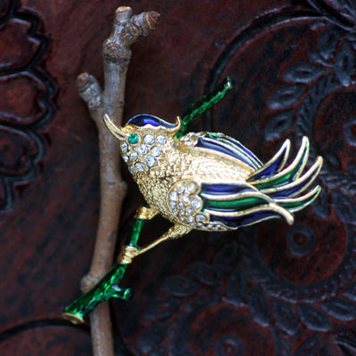 頭の冠毛がチャームポイントの小鳥のヴィンテージ・ブローチ。お顔と、両翼に埋め込まれたラインストーンのパヴェと、ダークなコバルトブルーとビリジアングリーが交互に塗られた羽根のエナメルがとても綺麗なお品です。