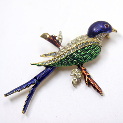 ラインストーンのパヴェとエナメル塗りが美しいツバメが小枝にとまっているデザインのヴィンテージ・バード・ブローチ。