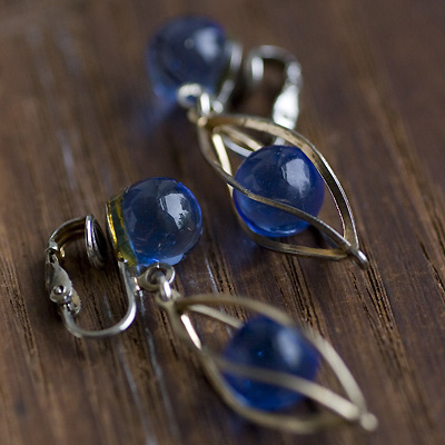 オールドプラスティックのブルーの珠がねじれたゴールドケージの中に入っているデザインがかわいいイヤリングです。