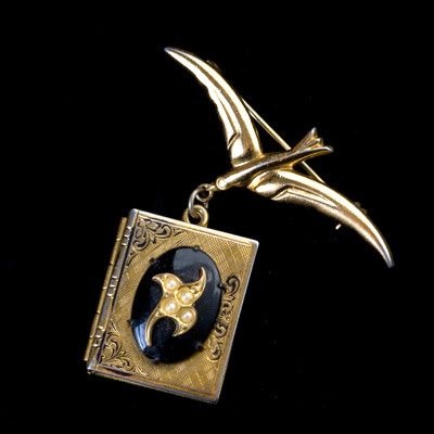 本を運んでいる鳥の姿がキュートで、ちょっと珍しいアンティーク・ブローチ。ブックデザインのチャーム部分はロケット・タイプで、開いた中に写真を入れることができます。