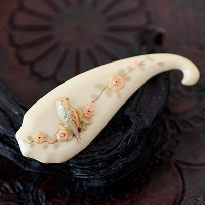 ややクリームがかったアイボリー色のペイズリーシェイプに、お花と小鳥の浮き彫りレリーフ。蔓と葉っぱがしなやかに描かれたヴィンテージ・ブローチ。なんともノスタルジックな絵柄と色合いは、童話の世界、絵本の世界を思わせ、やさしい気持ちにしてくれるお品です。