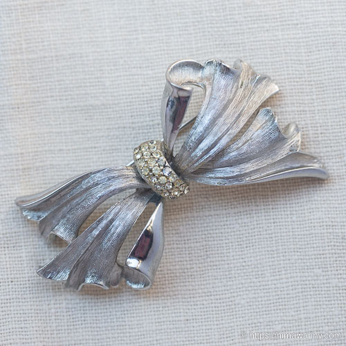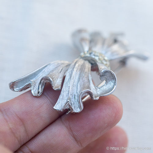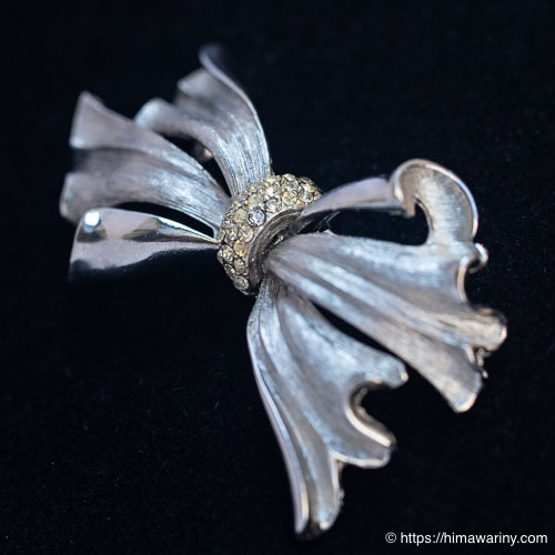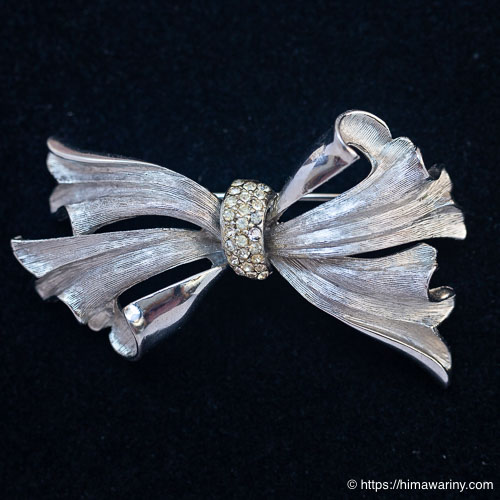 風になびくリボンのような、躍動感をとらえたデザインが素敵なヴィンテージ・ブローチ。リボンを結わえた部分は、小さなラインストーンのパヴェになっています。