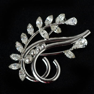 ラインストーンの藤の花のような房と流れるようなラインの蔓で形作られたヴィンテージ・シルバー・ブローチ。