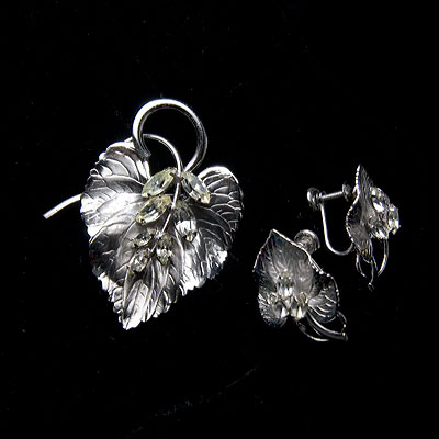 スターリングシルバー製の葉っぱモチーフにマーキース・シェイプのクリアー・ラインストーンの蔓の実が重ねられた芸術的なヴィンテージ・ブローチとヴィンテージ・イヤリングのセット。