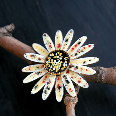 白地に赤、黄、黒を散らした模様のアートガラスの花びらがかわいいデイジーのヴィンテージ・ブローチ。花の中央は黒地に有機的な小さな黄色と白の水玉があしらわれた七宝焼きのようなアートガラスになっています。