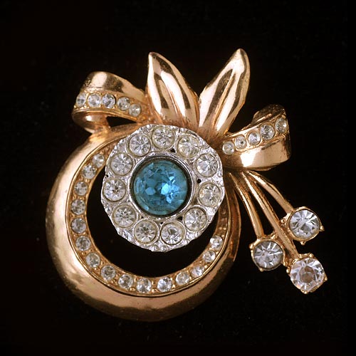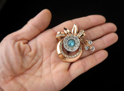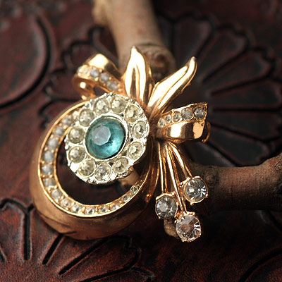 ●状態:★★★☆ビンテージ・ベリーグッド(アクアマリンカラーのラインストーンの箔に黒ずみが見られます。その周りをぐるり取り囲んでいるラインストーンの土台がいびつに見えますが、経年劣化によるものではなく、恐らく当初からの形状と思われます。拡大写真にてご確認ください。)