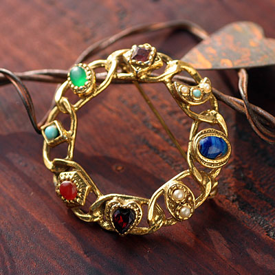 アンティークゴールドカラーのチェーン・サークルの上に、ヴィクトリア調モチーフが配されたヴィンテージ・ブローチ。