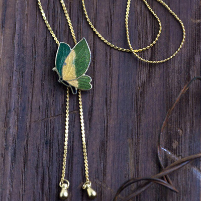 蝶は、ゴールドカラーメタルのフレームに、グリーン、イエローオーカー、ライトグリーン(羽根)と、ブラック(ボディ)のエナメルが埋め込まれたクロワゾネ(有線七宝、七宝焼き)。羽根部分のメタリックな輝き、細かな葉脈のようなラインが美しいお品です。