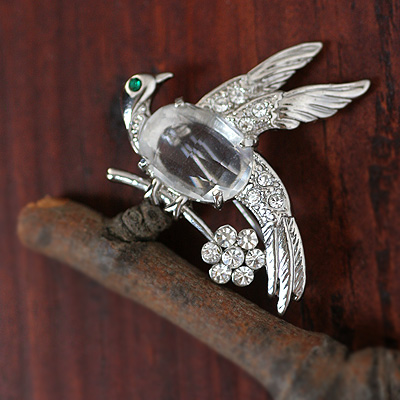つぶらなエメラルドグリーンの瞳が、メタルの銀色、ラインストーンやガラスのクリアーカラーという明るい色目の中でポイントとなっているヴィンテージ・バード・ブローチ。