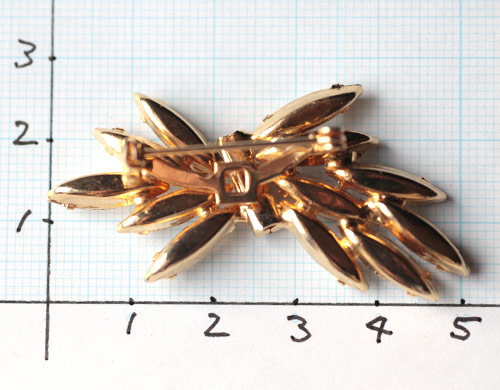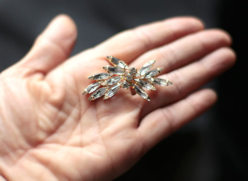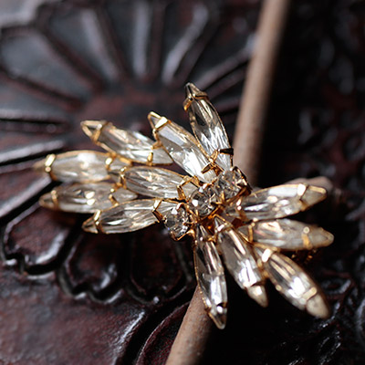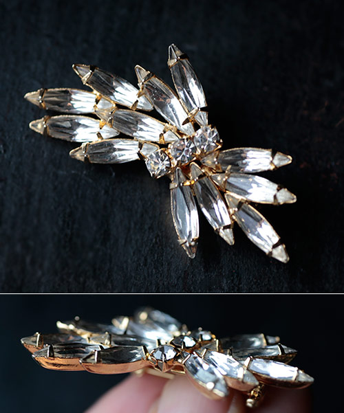 ナヴェットシェイプのラインストーンの葉っぱの束を、ラウンドシェイプのラインストーンのりボンで結わえて。クリスタルクリアなラインストーンの輝きと、それらを一つ一つ爪留めしているゴールドが美しいヴィンテージ・ブローチ。