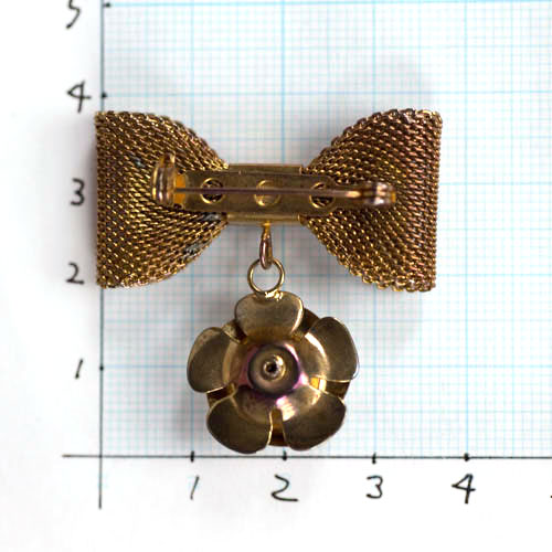 花の中央に一点小さなラインストーンが据えられたバラのパーツがゆらゆらと揺れるアンティーク・ブローチ。メッシュ・メタルのリボンは、中央でぎゅっと絞られていて、立体感があり、時を経てきたメタルならではの奥行きのある色合いがあります。
