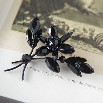 お花も葉っぱも、スレンダーなマーキースシェイプのブラック・ラインストーンと、やや幅広のラインストーンで表現、そして茎の交わるところと、葉の根元のところには、水滴でしょうか、大小のラインストーンがあしらわれたブーケのヴィンテージ・ブローチ。