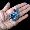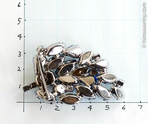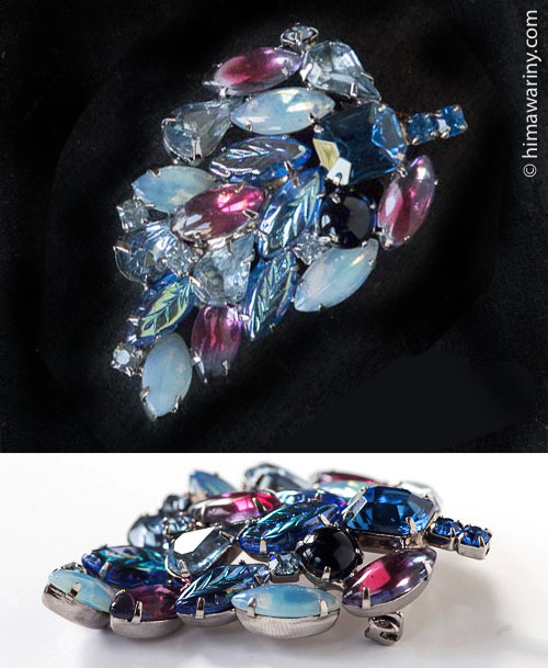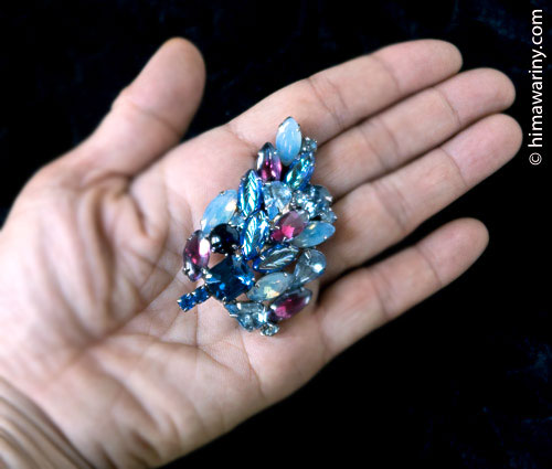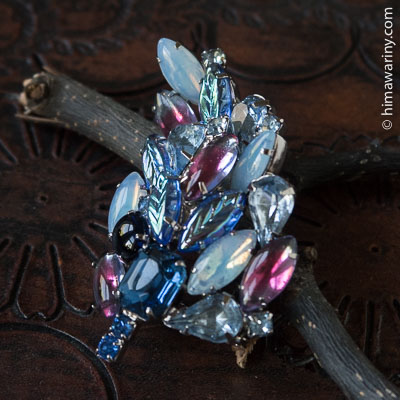 ブルー系のラインストーンの中に乳白色の半透明カボション、マジェンタ味を帯びたグレープの差し色が入った義ブレ・ガラス・カボション(ギブレ Givré とは、フランス語で「霜に覆われた、凍結した」の意【発音:ジーヴレ】とのこと)が絶妙な配置で散りばめられたゴージャスなヴィンテージ・ブローチ。