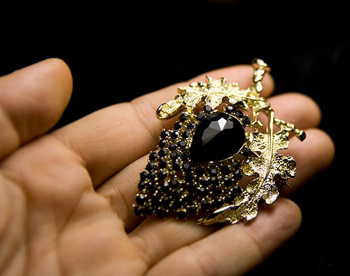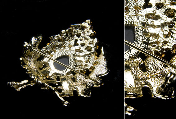 黒のラインストーンと、やや白っぽい金色のコントラストが美しい、大人のヴィンテージ・ブローチ。小枝からたわわに実る小さな実だけでなく、大きなティアドロップシェープの石が配置されているのが個性的。葉の表面にはテクスチャーがあるので光を静かに反射している、趣のあるお品です。