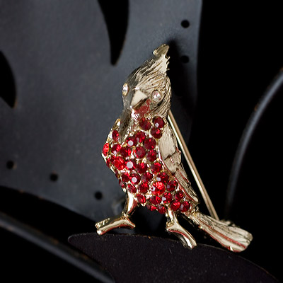 おなかにルビーレッドのラインストーンがぎっしり埋め込まれた鳥のヴィンテージ・ブローチ。バードブローチは、真横や真っ正面の姿の鳥が多いですが、こちらのお品は斜めのスタイルで、反立体的な像なので、アイスラインストーンの目が2つあります。