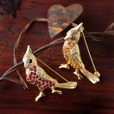 おなかにラインストーンがぎっしり埋め込まれた鳥のヴィンテージ・ブローチ。バードブローチは、真横や背中からとらえた姿が多いですが、こちらのお品は斜めからとらえた半立体的な凛々しい立ち姿で、ラインストーンの瞳は2つともぱっちり。翼、冠などディティール、おなかのふっくらしたフォルム、どこをとってもかわいいだけでなく、素晴らしいクラフトワークです。