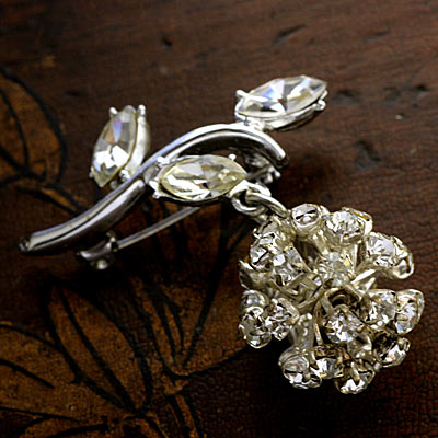 マーキースシェープのラインストーンの葉っぱがついた小枝から、ラインストーンの実がたくさん集まったくす玉がぶらさがったヴィンテージ・ブローチ。