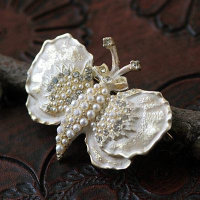ボディには小さなシードパール、羽根にはパールとラインストーンが埋め込まれていて、下のゴールドが透けて見えるくらいにうっすらとホワイトのペイントがほどこされ、全体が白っぽい雪のような印象のお品です。