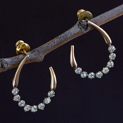 8つのラインストーンが連なった馬蹄型オープン・フープピアスです。左右つけかえると、また違った雰囲気になります。
