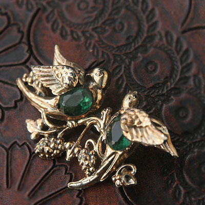 仲睦まじいラブバード・カップルが、たわわに実のなる小枝にとまる姿をデザインしたアンティーク・ブローチ。鳥の動きが見事に捕らえたお品です。