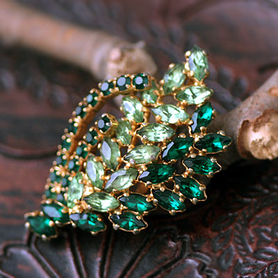 エメラルドグリーンと、ライムグリーンのラインストーンがふんだんに使われたフラワー・モチーフのアンティーク・ブローチ。時を経た風合いがカラフルながらにしっとり美しく、シックでゴージャスな表情となっています。