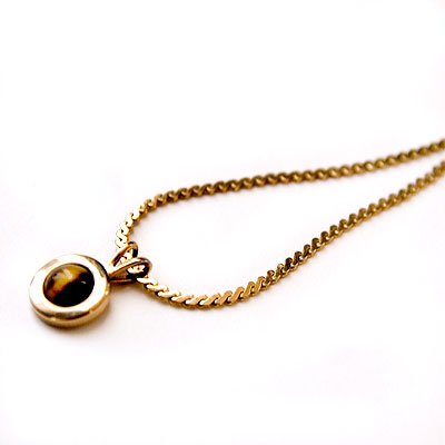 幅1mmほどの美しいサーペンタイン・チェーンのしなやかゴールドのきらめきが、天然石タイガーアイ(虎目石)の神秘的な深い琥珀色から金褐色へと変貌するキャッツアイ効果のある瞳カボションと素敵にマッチしたヴィンテージ・ペンダントネックレス。アメリカのコスチュームジュエリーブランド、Emmons エモンズのお品で、ネックレスのクラスプに、封筒のようなデザインのタグに刻印があります。Emmonsは、1949年にニューヨークの隣州、ニュージャージーで創立。1981年まで継続していたメーカー。エモンズというブランド名は、創始者の奥さんの名字にちなんでつけられました。