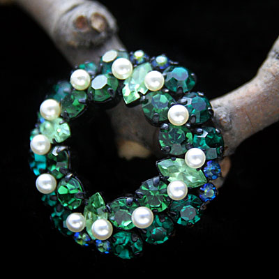 色とりどりのグリーンにホワイトパールが散りばめられたオーストリア製のヴィンテージ・ブローチ。普段のファッションには勿論、グリーンを基調としたデザインから、クリスマスを意識したリースブローチとしてもお使いいただけるお品です。