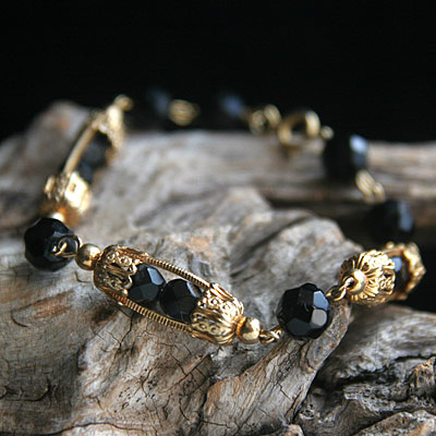 ファセットカットのオニキスカラー・ガラスビーズがフィリグリー・カプセルに閉じこめられたパーツがお洒落なヴィンテージ・ブレスレット。シックで大人っぽいテーストが素敵なお品です。