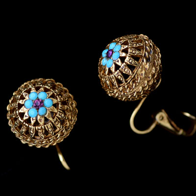 アンティーク調の金古美のメタルのボールの中央にターコイズブルーのファセットグラス、バイオレットのラインストーンのお花が据えられたヴィンテージ・イヤリング。ボールの部分は、オープンワーク(透かし細工)で、編み上げられたクロシェのよう。とても立体的で動きのあるオーガニックなデザインのこのジュエリー、謎の生命体のような独特の世界観があり、不思議な魅力を醸し出しています。