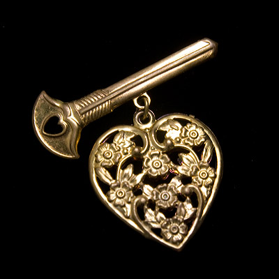 花の透かし模様のハート型チャームがゆらゆら揺れるアンティーク・ブローチ。鍵にもハートの穴があいているのがキュート!