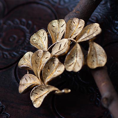 葉の表面はとても繊細なテクスチャーがあり、ゴールドの輝きが、写真よりも肉眼で見ると綺麗。鋭く彫り込まれた葉脈が、一段と綺麗なゴールドの輝きをみせ、素敵な存在感を与えています。